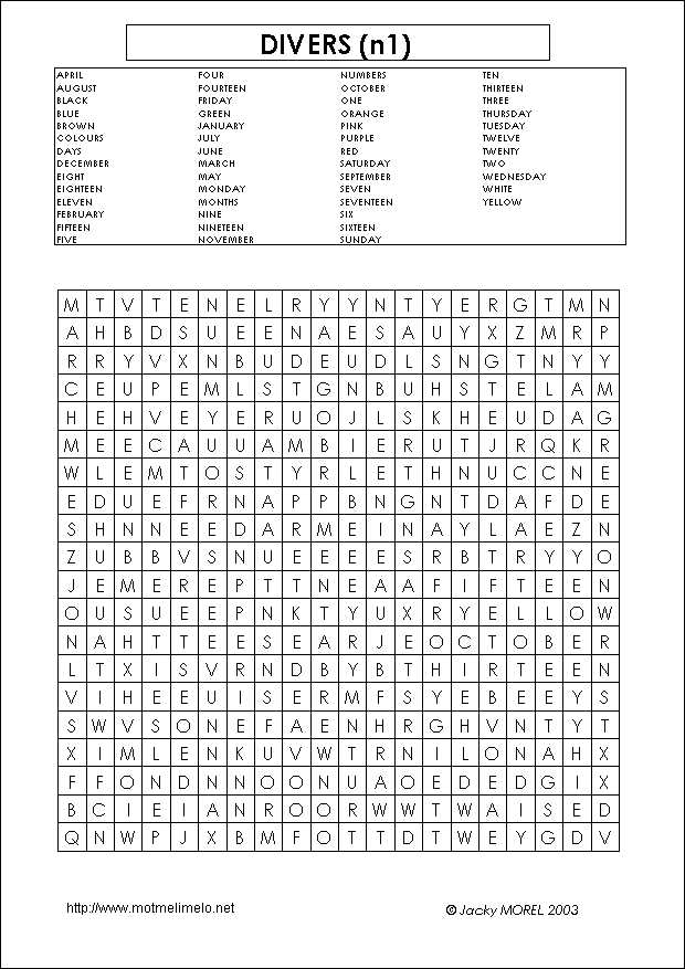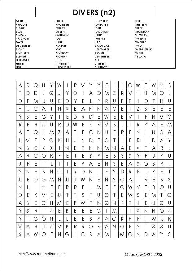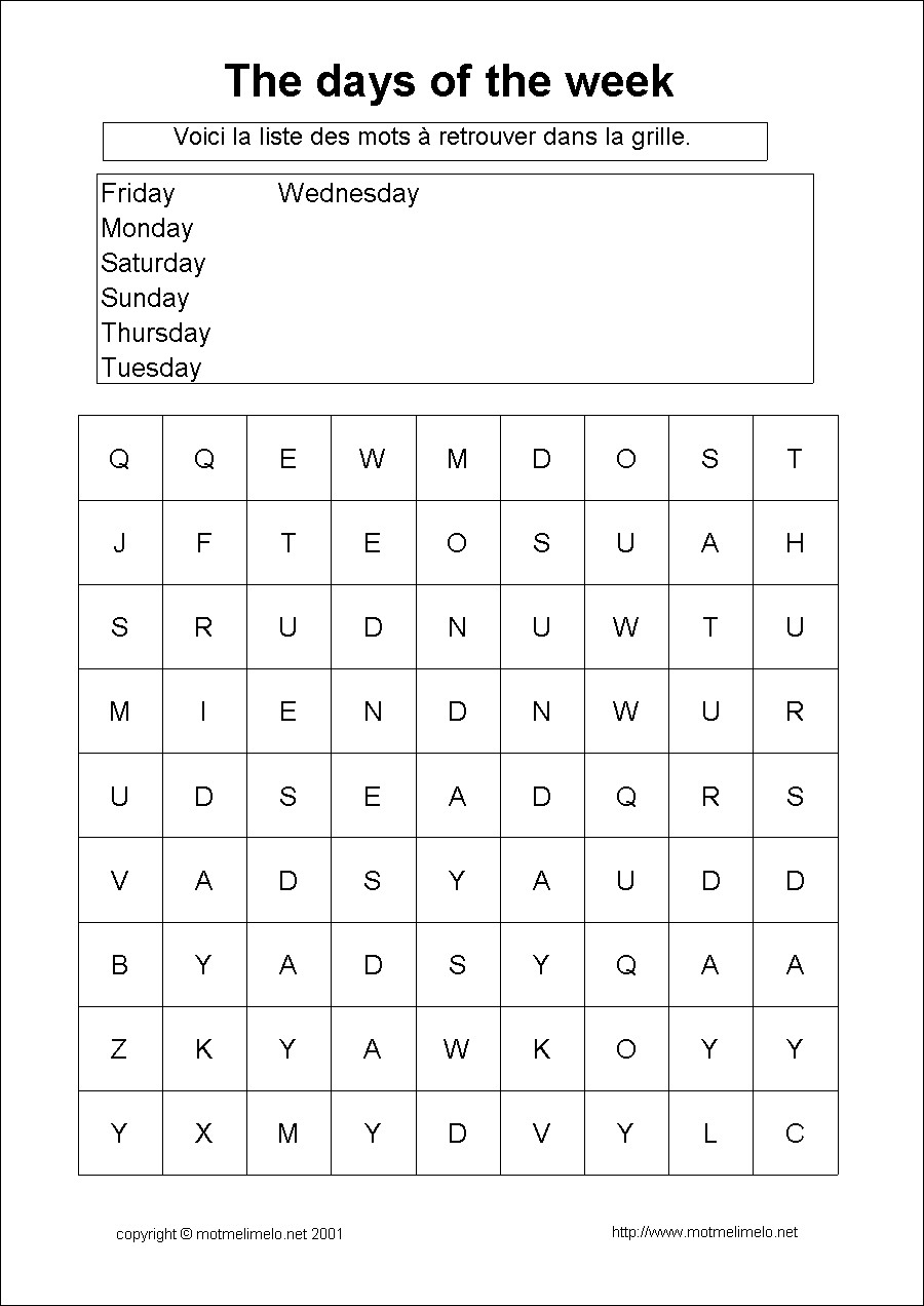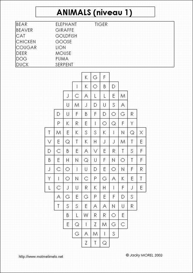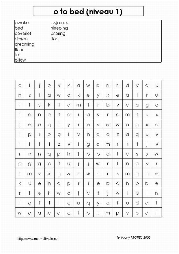 | mots utilisés: bed sleeping coverlet pillow pyjamas awake floor top dowm lie snoring dreaming | mots utilisés: Monday Tuesday Wednesday Thursday Friday Saturday Sunday | mots utilisés: GIRAFFE LION PUMA ELEPHANT DOG CAT SERPENT COUGAR BEAR BEAVER MOUSE CHICKEN DUCK GOOSE TIGER DEER GOLDFISH | SUNDAY MONTHS JANUARY FEBRUARY MARCH APRIL MAY JUNE JULY AUGUST SEPTEMBER OCTOBER NOVEMBER DECEMBER NUMBERS ONE TWO THREE FOUR FIVE SIX SEVEN EIGHT NINE TEN ELEVEN TWELVE THIRTEEN FOURTEEN FIFTEEN SIXTEEN SEVENTEEN EIGHTEEN NINETEEN TWENTY COLOURS BLUE RED YELLOW BLACK WHITE GREEN PINK ORANGE BROWN | mots utilisés: chips hamburger pear cheese banana egg pizza tomato apple icecream orange chocolate |