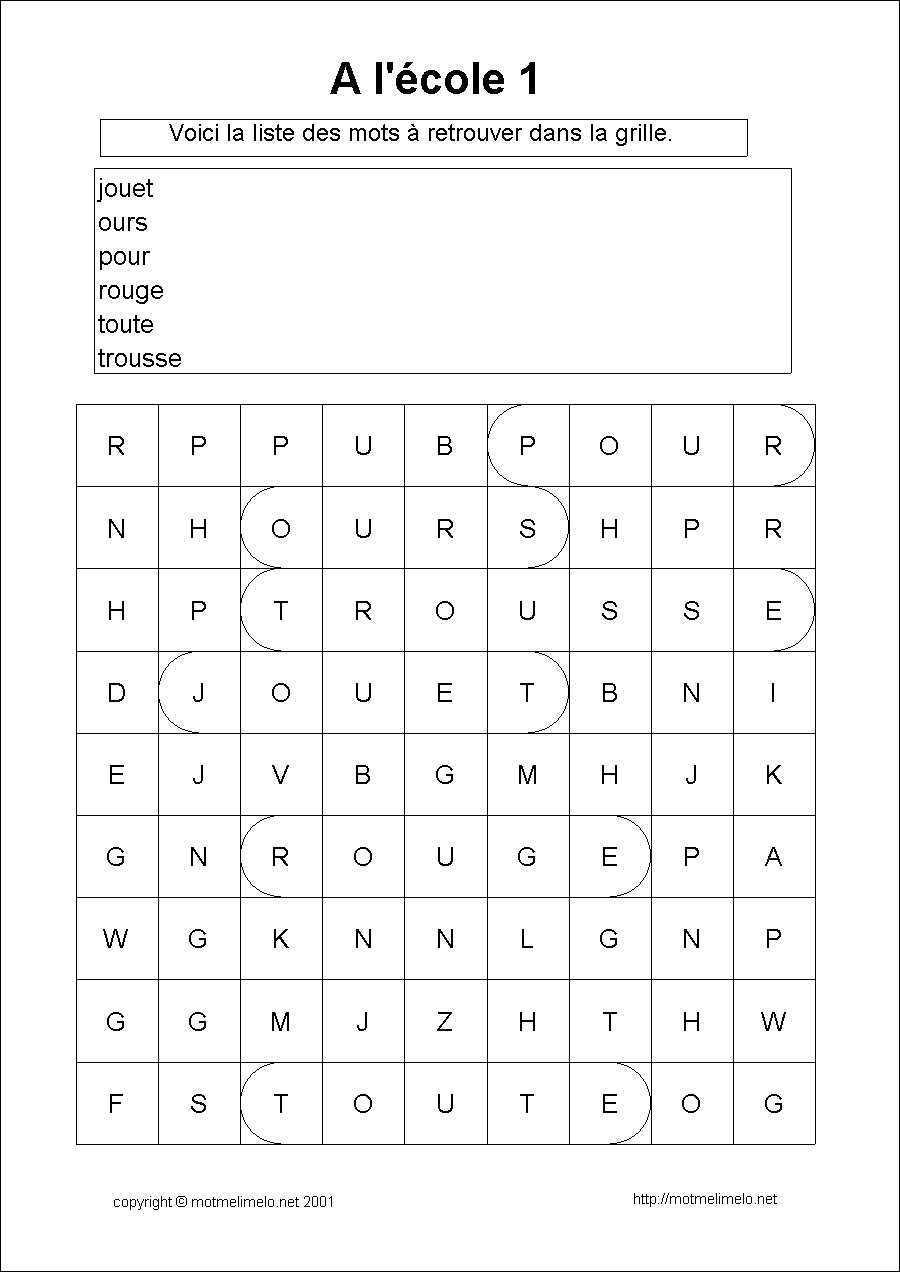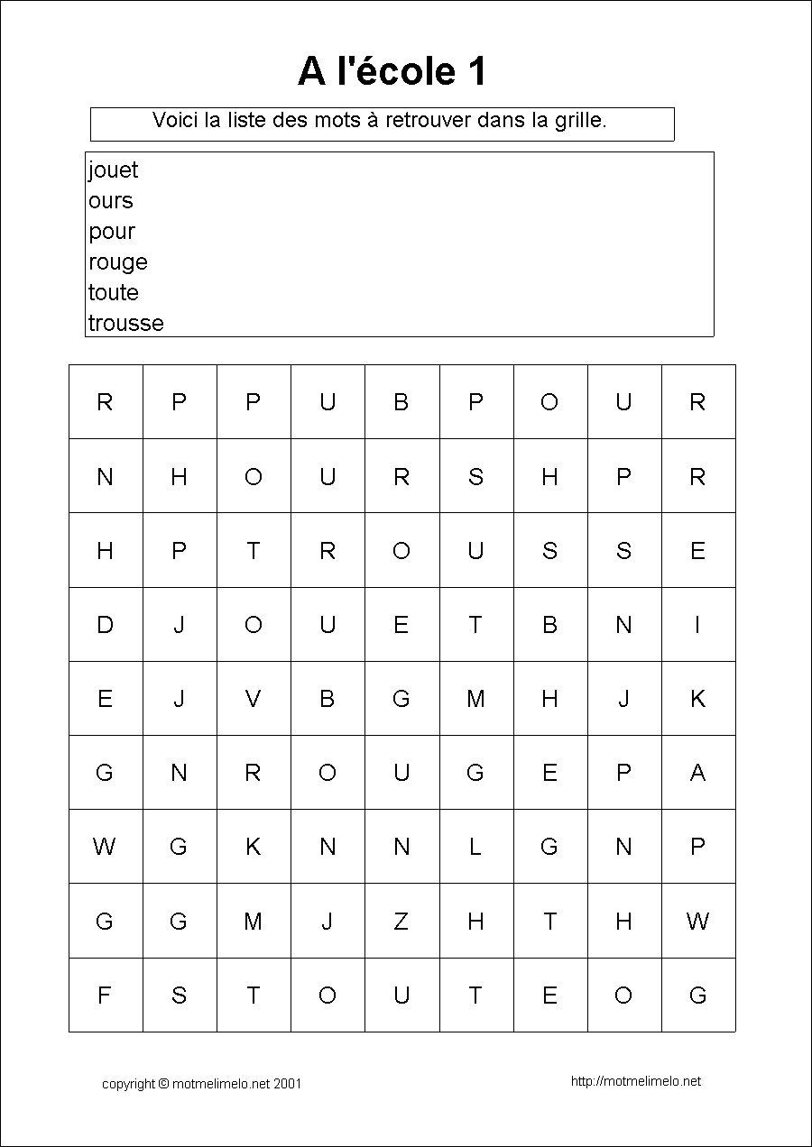 télécharger les mots mêlés (cliquer ci-dessous) à l'école (niveau 1)
