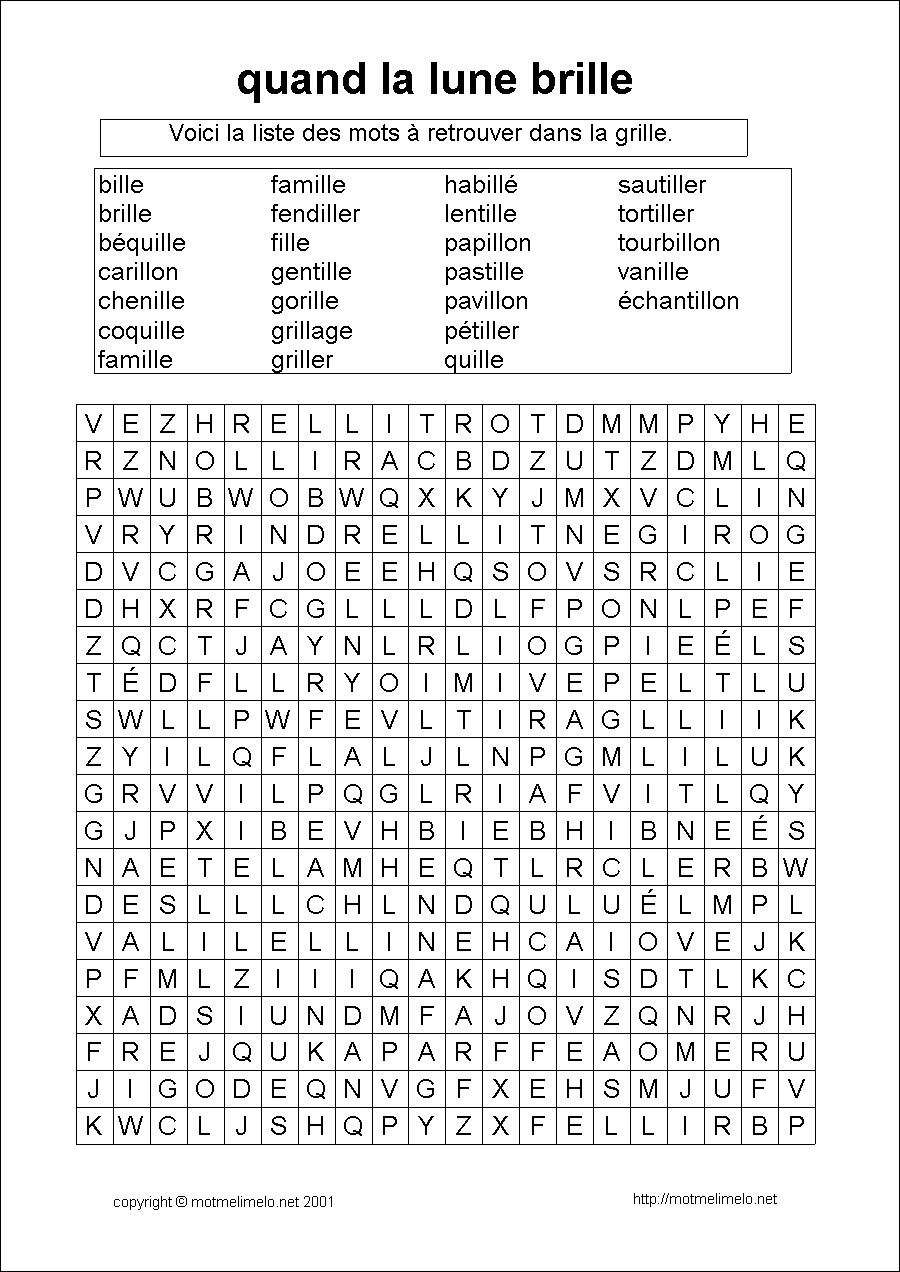 liste des mots utilisés: béquille bille brille carillon chenille coquille échantillon famille fendiller fille gentille gorille grillage griller habillé lentille papillon pastille pavillon pétiller quille sautiller tortiller tourbillon vanille |
