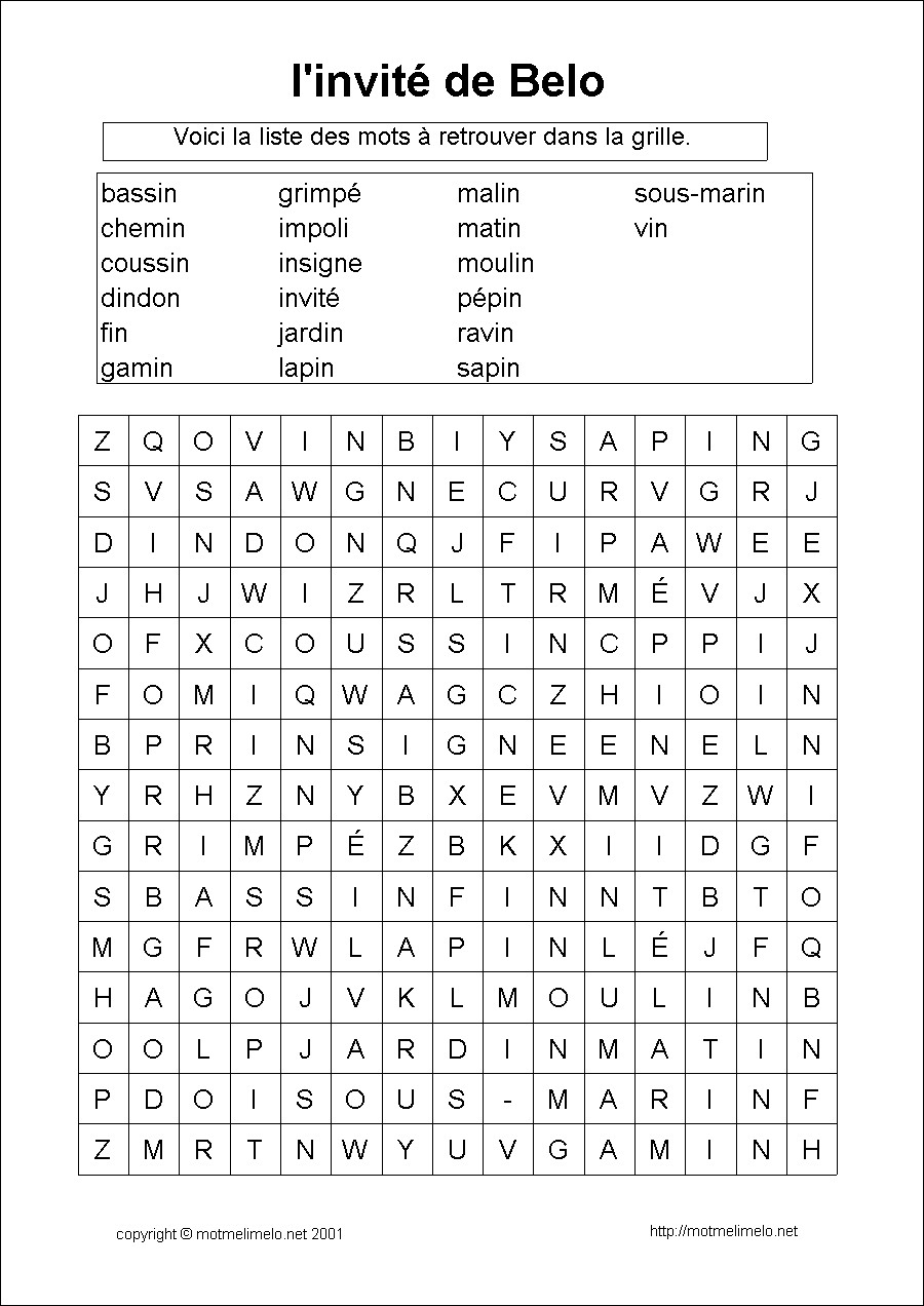 mots utilisés: bassin chemin coussin dindon fin gamin grimpé impoli insigne invité jardin lapin malin matin moulin pépin ravin sapin sous-marin vin